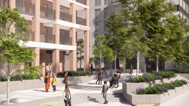 Plans for the development also include provisions for a new public plaza, landscaped gardens, communal spaces, play areas, retail units and a childcare facility.